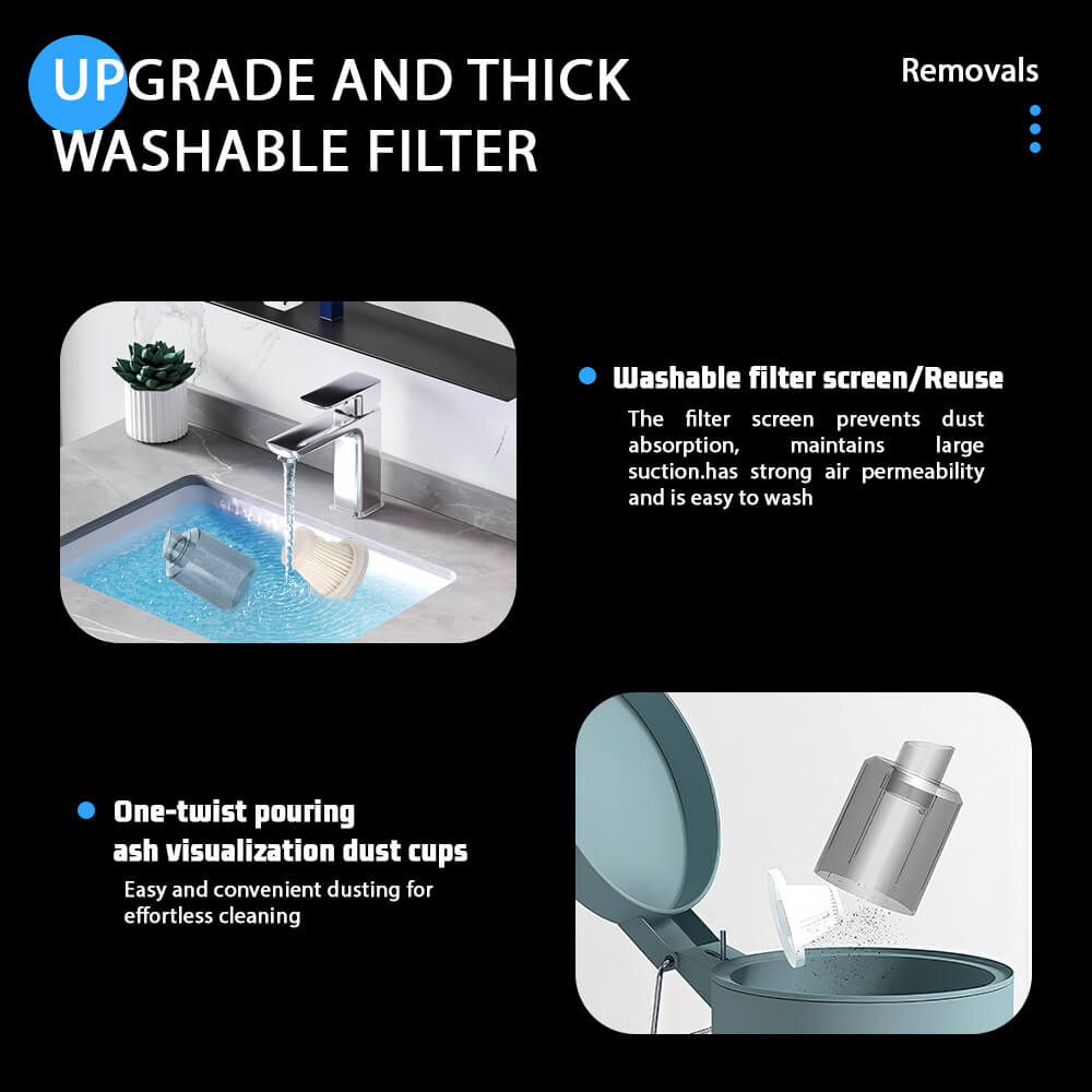 - Upgrade and Thick Washable Filter: Open the visual dust cup to pour out the garbage and then take out the filter for cleaning.