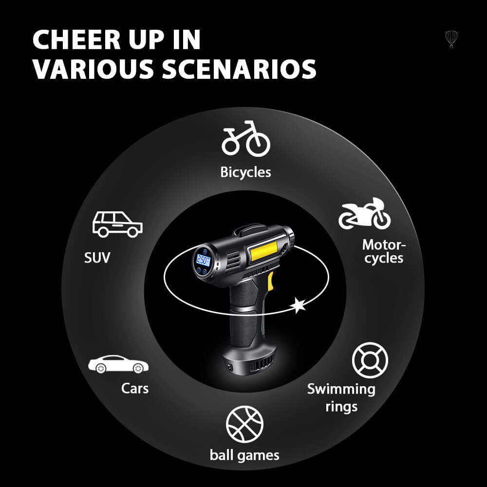 - Suitable for inflating tires, sports balls, and other inflatables while on the go.