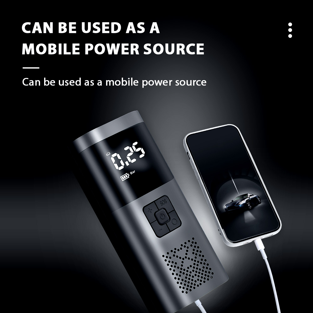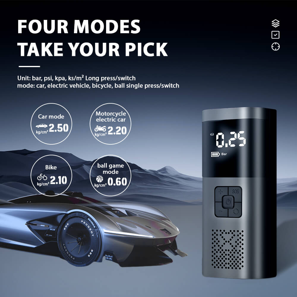 - The portable air compressor offers 4 preset modes and manual pressure adjustment.